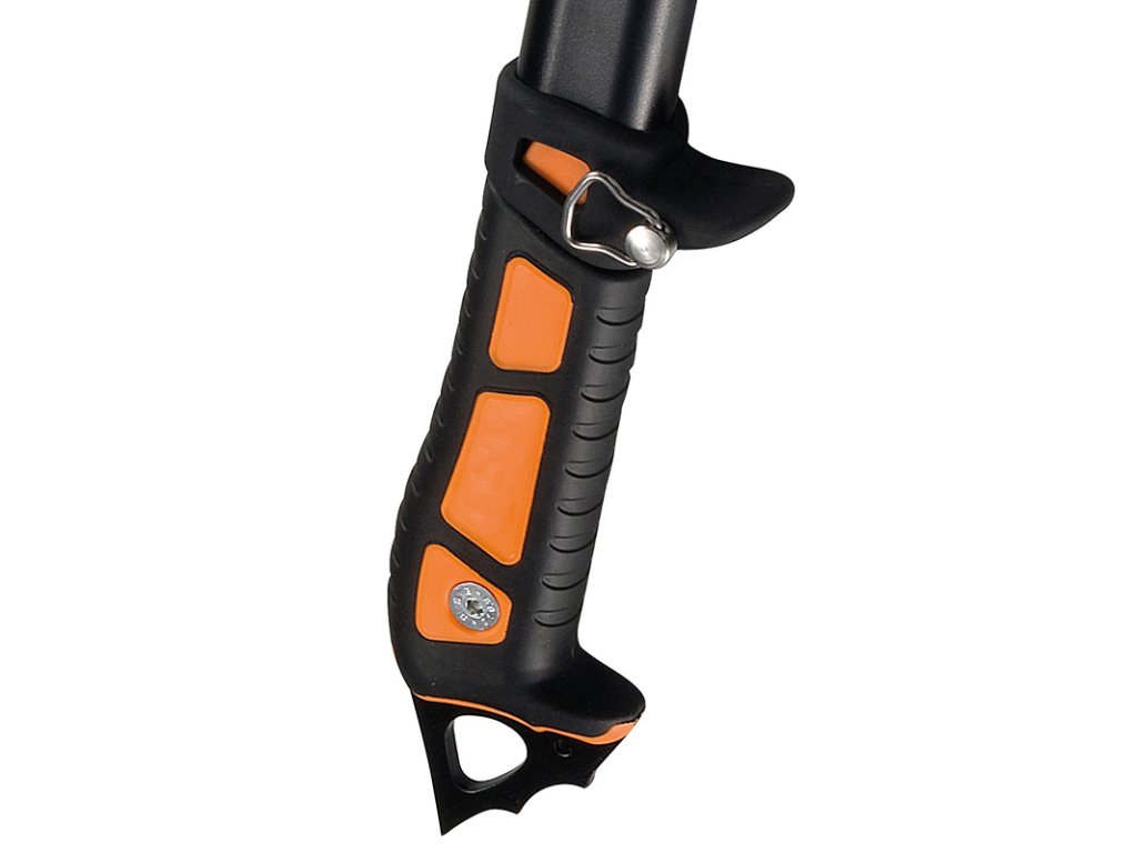 Ocelový „T“ hrot z chromované oceli poskytuje vysokou pevnost a jistotu při zasekávání do ledu i tvrdého sněhu. Vrchní část hrotu je bez zubů, takže při opoře nedochází k poškození rukavic.