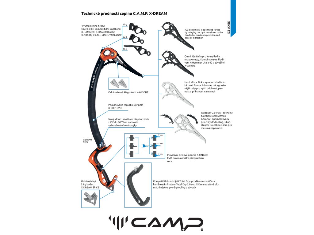C.A.M.P. X-Dream je vysoce výkonný technický cepín navržený pro lezení v kolmém ledu, mixech i čistý drytooling. Nová generace tohoto ikonického modelu přináší ještě větší výkon, variabilitu a ergonomii – bez složité demontáže nebo kompromisů.