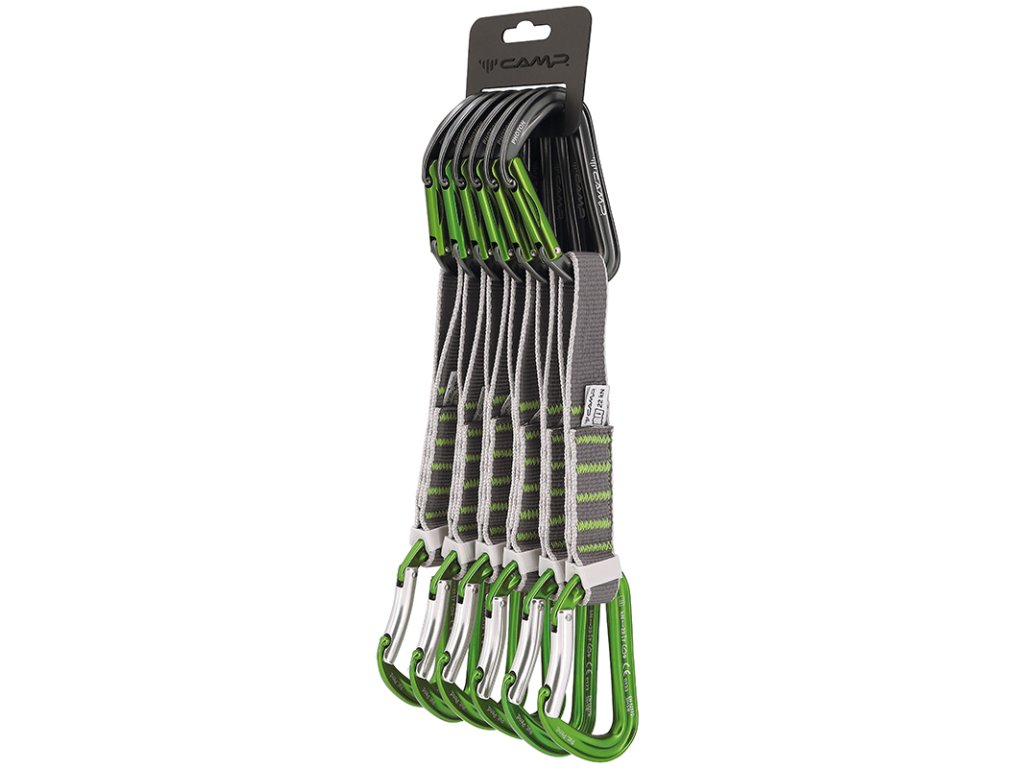 Každá expreska kombinuje ultralehké plné karabiny CAMP Photon Straight Gate (horní) a CAMP Photon Bent Gate (spodní). Tyto full-size keylockové karabiny patří mezi nejlehčí ve své kategorii a nabízejí perfektní manipulaci i při rychlém cvakání v těžkých krocích.