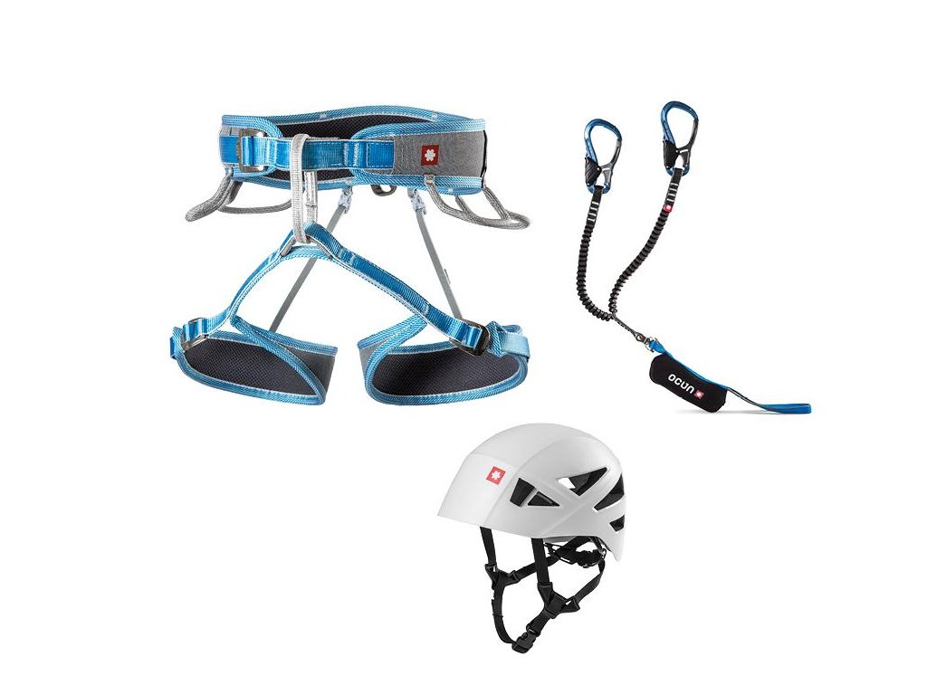 Feratový set Ocún Via Ferrata Twist Tech Eco Captur Pro Swivel Shard Set pro bezpečný pohyb na zajištěných cestách označených jako via ferrata, který zahrnuje sedací úvazek, lezeckou helmu a tlumič pádu.