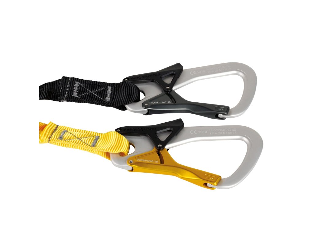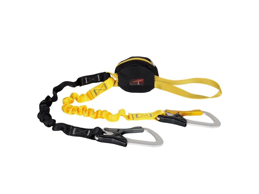 Set obsahuje tlumič pádu s trhacím mechanismem, který plynule absorbuje energii pádu a chrání lezce před prudkými nárazy. Robustní elastické smyčky zajišťují přirozený rozsah pohybu a zároveň se smršťují, když nejsou v akci. Odolná textilní smyčka pro připojení k úvazku poskytuje pevné a bezpečné uchycení.