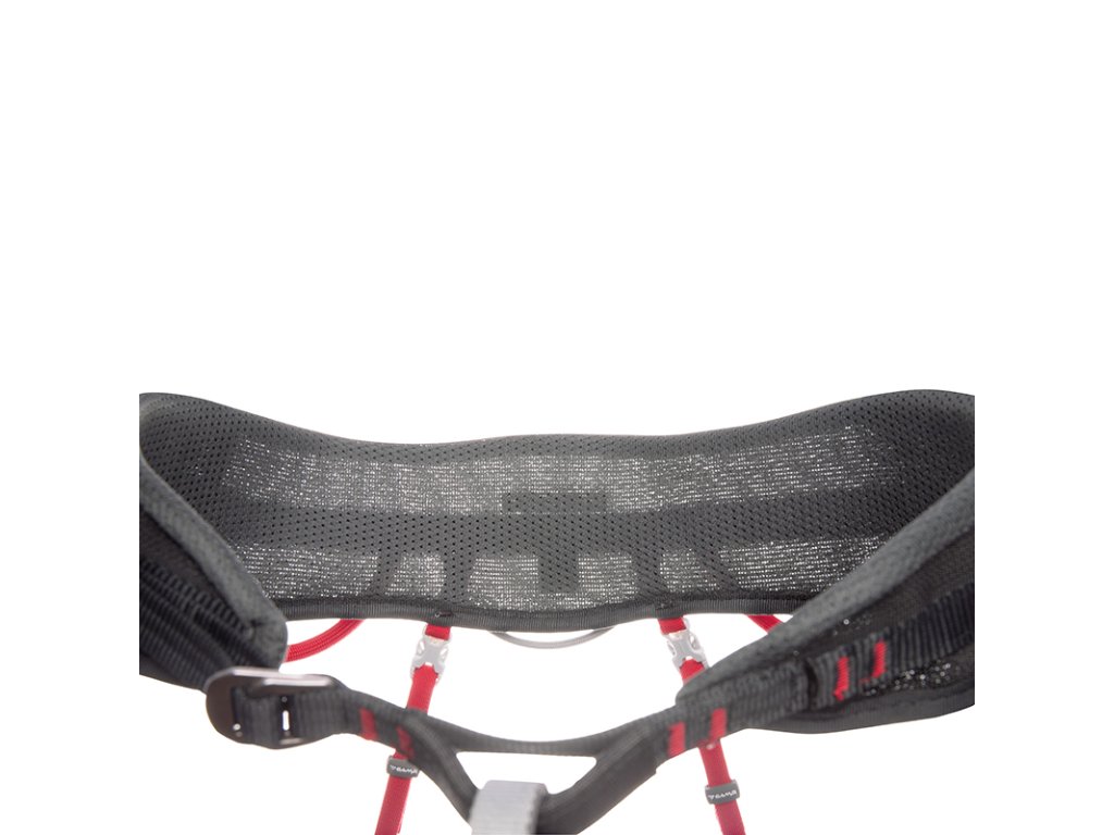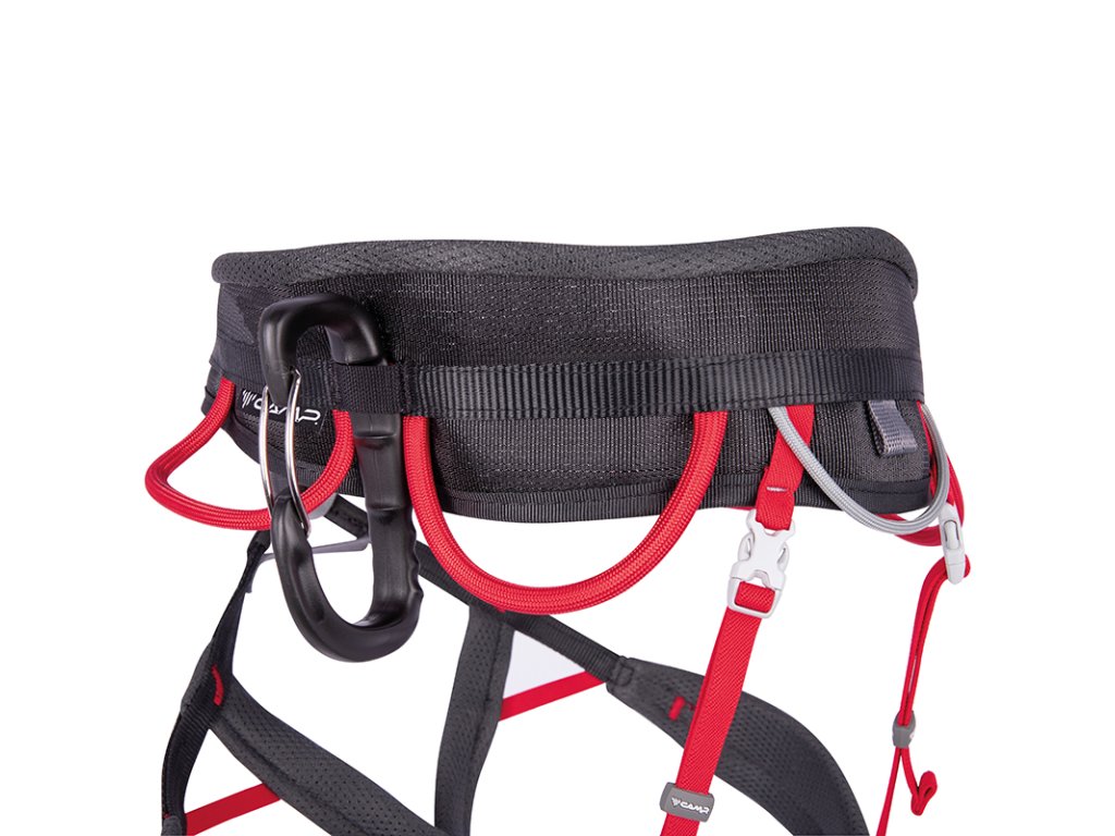 Úvazek je vybaven nerezovou auto-uzamykatelnou rychlosponou v pase, barevně odlišeným navazovacím okem pro zvýšení bezpečnosti a promyšleným systémem materiálových poutek. Přední poutka jsou tvarovaná pro snadné cvakání expresek, zadní jsou pružná, aby nepřekážela při pohybu. Nechybí ani speciální poutko na maglajz pytlík a možnost rozšíření o nosiče materiálu C.A.M.P. Hub.