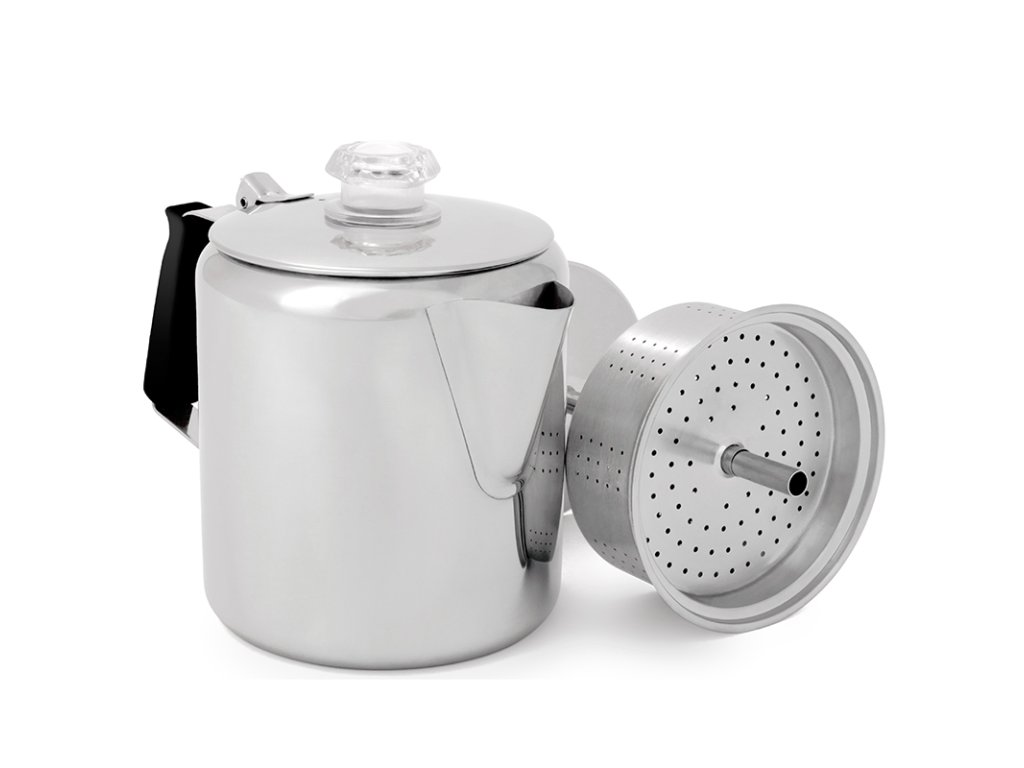 GSI Outdoors Glacier Stainless Percolator je ultra odolný kávovar vyrobený z kvalitní nerezové oceli, dostupný ve velikostech pro 3–9 šálků kávy.