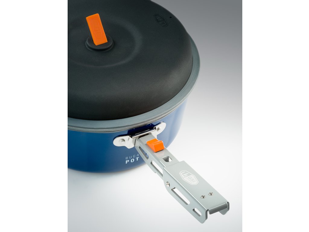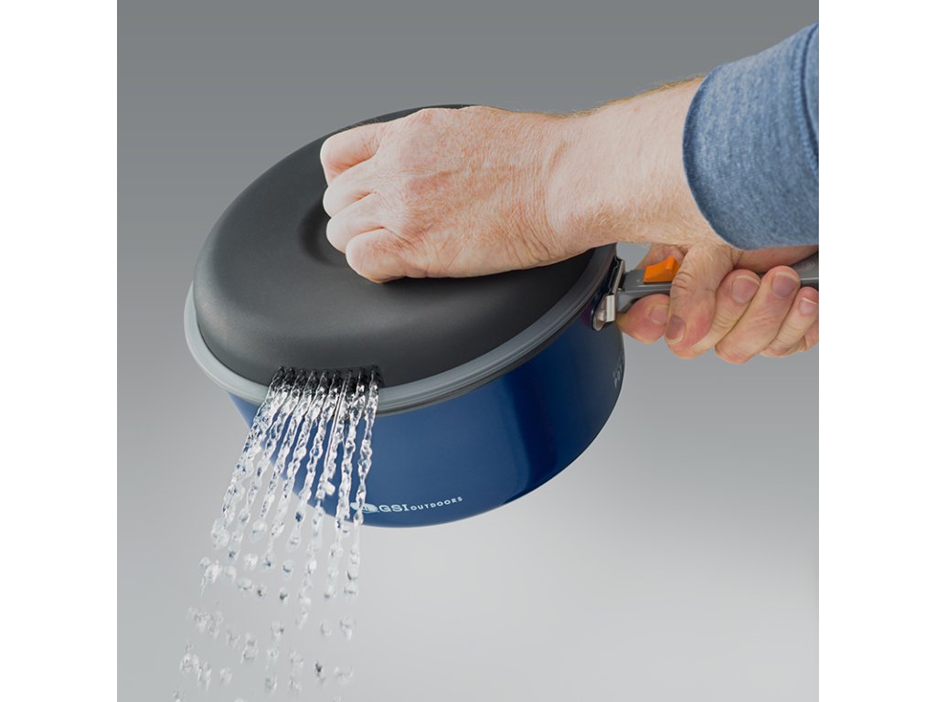 Perforované pokličky umožňují únik páry a zároveň fungují jako sítko pro slití vody. Praktická skládací a odnímatelná rukojeť se dá jednoduše přehazovat mezi hrnci a pánví. Celý obsah lze kompaktně uložit do většího hrnce a převážet v transportním obalu s pevnými uchy, který lze využít jako umyvadlo nebo nádobu na přenos vody.