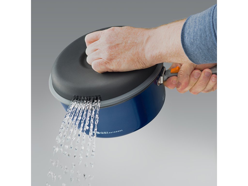 Perforovaná poklička z BPA-free plastu slouží nejen pro únik páry, ale i jako sítko pro slití vody z těstovin. Pánev může zároveň fungovat jako poklice. Barevně odlišené nádoby usnadňují orientaci mezi členy posádky.