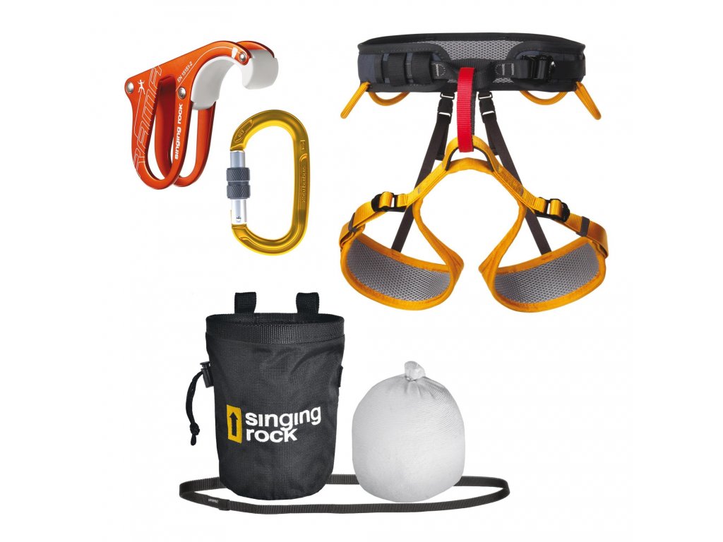 Speciální set Singing Rock Packet Gym pro začínající lezce, který obsahuje univerzální sedací úvazek VERSA II s nastavitelnými nohavičkami a posltrováním, šroubovací oválná karabina Singing Rock Oxy, poloautomatické jistítko Singing Rock Rama. Dále pytlík na magnézium, opasek a magnézia.
