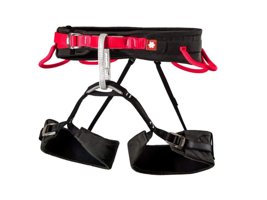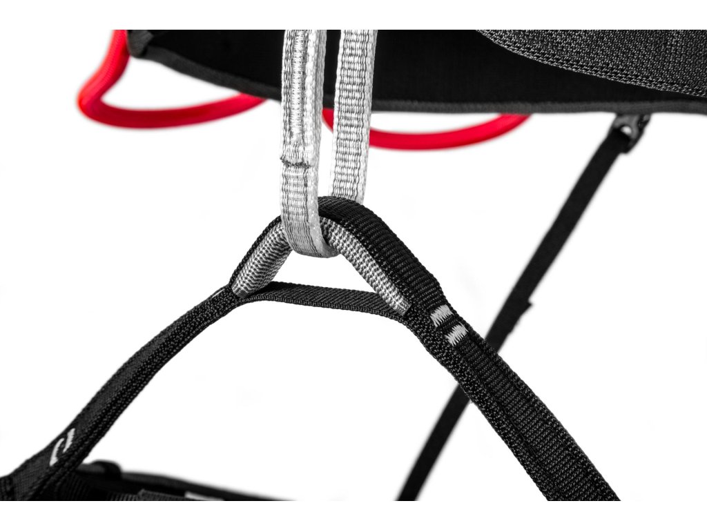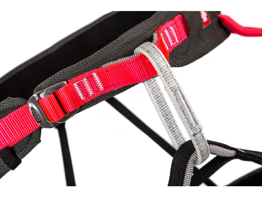 Třípřezkový systém z nerezové oceli (SS-420J2) umožňuje přesné a bezpečné nastavení. Úvazek je doplněn o pět poutek na vybavení, která jsou strategicky rozmístěna pro snadný přístup k expreskám, jistítku či dalšímu materiálu.