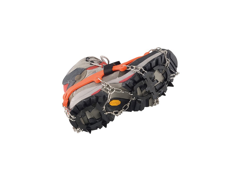 Elastický návlek z odolného elastomeru zajišťuje snadné nazouvání na jakýkoliv typ obuvi – od pohorek až po pracovní boty. Konstrukce drží pevně na místě a přizpůsobí se pohybu chodidel, aniž by sklouzávala.