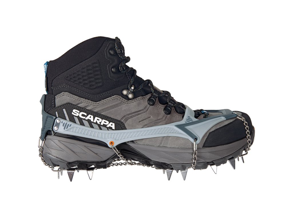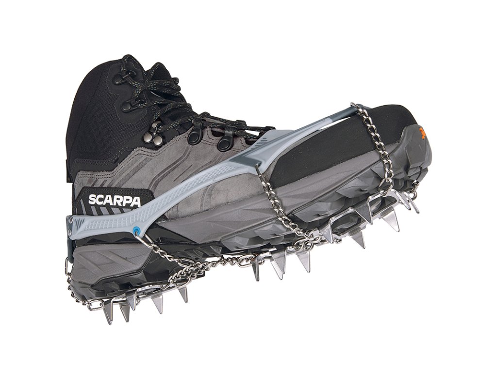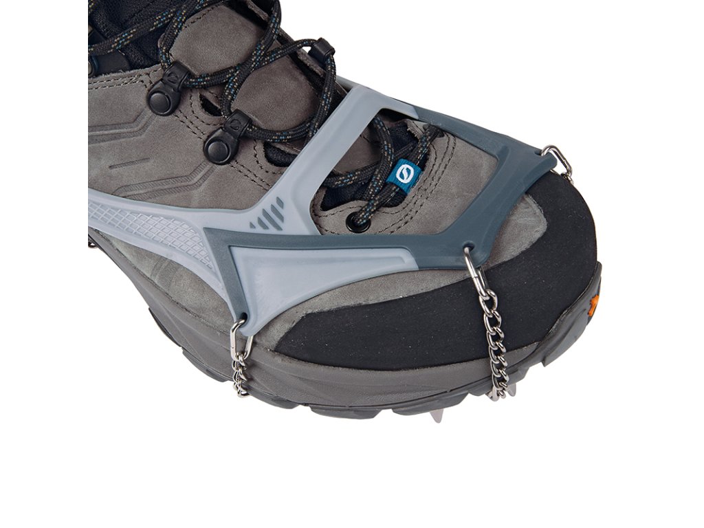 Přední hroty jsou dvojitě kloubově uchycené, takže se přirozeně přizpůsobují pohybu boty i členitému terénu. Minimalizované řetízky a spojovací články snižují hmotnost bez kompromisů v odolnosti.