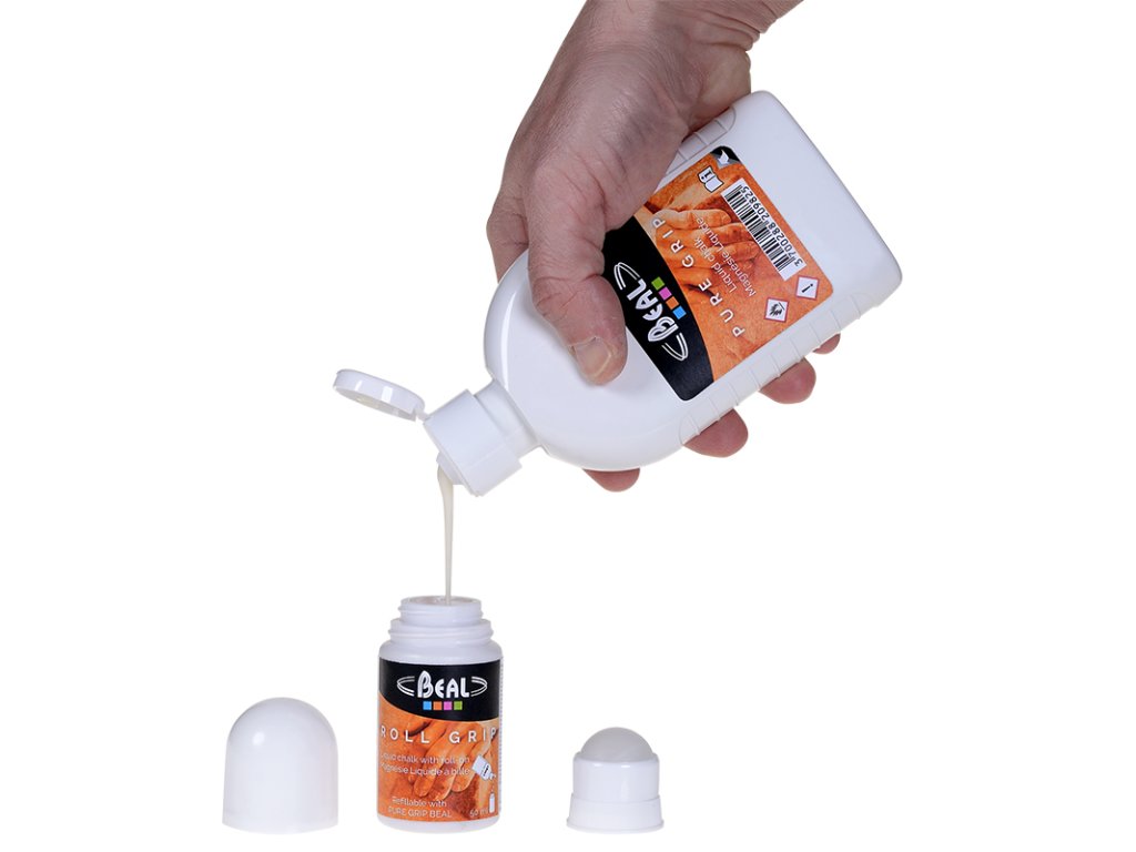 Lahvička je znovuplnitelná – stačí ji doplnit tekutým magnesiem Beal Pure Grip. Díky kompaktnímu 50ml balení se snadno vejde do pytlíku na maglajz nebo do kapsy lezeckého batohu.