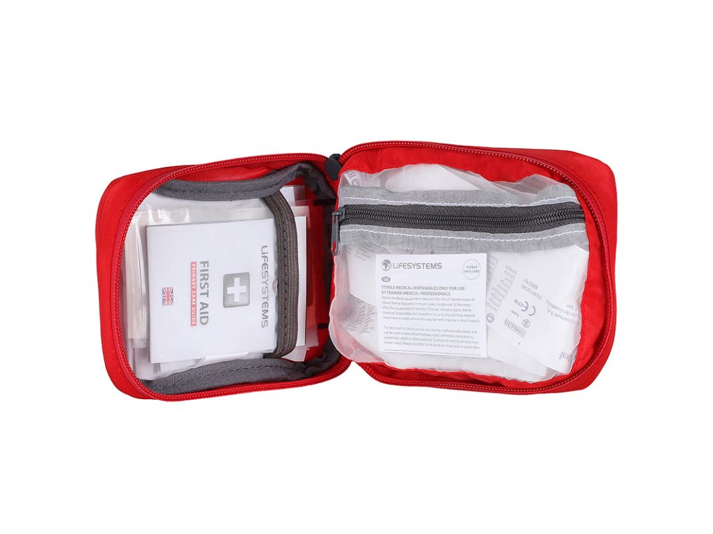 Kompaktní lékárnička první pomoci Lifesystems Sterile First Aid Kit. Přehledné uspořádání a snadný přístup k materiálu. Po rozbalení lékárničky je veškerý materiál snadno dostupný a rozdělený do různých sekcí.